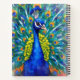 A vibrant peacock in colors of blue, green, yellow and orange. His tail feathers spread to show his style.