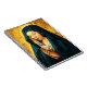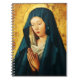 El fondo claro y oscuro contrasta con la cabeza inclinada radiante de la Virgen y el frente blanco que la cubre, y sus manos están cerradas suavemente juntas