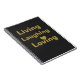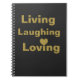 Cuaderno inspirador en espiral negra y dorada "Living, Laughing and Loving". El cliente puede cambiar el color de fondo negro. Por celeste@khoncepts.com