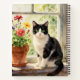 An illustration of a black and white cat sitting on a flower filled window sill illustration personalized notebook for those that love their tuxedo cats.