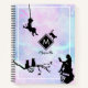 Keep track of your busy schedule with this customized notebook! Cover: At the very center, white against black, lies the first letter of your name (in capitals) inside a diamond shaped frame. Under it goes your first name, in black, in cursive letters. Against a light galaxy themed background stand four silhouettes: A girl on a swing at the top left; a cat taking a stroll around the diamond shaped frame; a cat couple enjoying each other's company on a tree branch at the bottom left; and a young lady reading a book atop a pile of books at the bottom right. Please notice that by clicking to customize further you can resize and reposition all the icons as well as change their fill colors (which is set by default as black).