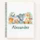 Cuaderno de dibujo de animales de la jungla de color de agua Safari. Los animales bebés incluyen elefante, mono, jirafa, rinoceronte, cebra y león en hojas de helecho. Vegetación botánica acuarela. Añadir nombre.
