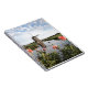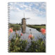 Notebook with a windmill and a canal with pink dahlia flowers in a landscape in Holland.
