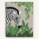 A solitary zebra walking amongst the monstera, ivy and bird of paradise leaves.