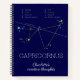 Capricornus de Constelación Zodiac o cabra con cuerno. El color de las estrellas es casi real. Nombres de objetos espaciales y de estrellas. Según uno de los mitos, Capricornus es una criatura que es una mezcla de un pez y una cabra; el nombre significa "cuerno de cabra" en latín. La historia se desarrolla de la siguiente manera. Baco - el dios del vino estaba comiendo a orillas del Nilo, y saltó al río. La parte submarina de él se transformó en un pez, mientras que su cuerpo superior se convirtió en una cabra. El aspecto positivo es que, desde su posición, Bacchus vio venir el tifón gigante a matar a Júpiter. Así que Capricornus sopló las tuberías y el tifón huyó. Júpiter, también conocido como Zeus, puso la nueva forma de Baco en el cielo como agradecimiento. Capricornus es la constelación zodiaca. El Sun atraviesa la zona a lo largo de la línea Ecliptic entre el 22 de diciembre y el 19 de enero. Un bloc de notas único, único en su clase, hermoso y divertido en espiral para que cualquiera pueda escribir valiosas ideas. ¡Personalizable. Puede cambiar imágenes y puede cambiar o eliminar textos de plantilla en la parte delantera y en la parte posterior. No olvide usar el botón "Personalizar", o "Editar Diseño" (como puede ser el funda). Le transferirá al área "Herramienta de diseño" donde puede usar la opción "LLENAR/FIT" para AJUSTAR EL DISEÑO AL TAMAÑO Y FORMA del producto, para rotarlo, para cambiar la posición, y el color del fondo, etc. Sólo sé creativo, disfruta y sé feliz.