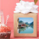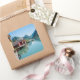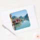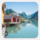 Pegatina de recuerdos cuadrado de un paisaje con casas de barco en la aldea de Fjrland (Mundal) y montañas con reflejo en el agua del fiordo Fjrlandsfjord, Sogn og Fjordane en Noruega.