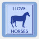 "El texto en negrita en la parte superior dice ""I LOVE""" encima de un gráfico estilizado de un caballo de un costado. El caballo está centrado en un cuadrado azul claro con un borde más oscuro, y la palabra "CABALLOS" se coloca en la parte inferior.