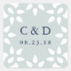 Selle sus sobres de invitación a la boda, favores y más con nuestros elegantes pegatinas de inspiración marroquí en azul pastel y blanco. El diseño cuadrado redondeado presenta sus iniciales y fecha boda en la marina, rodeado por un borde geométrico en blanco sobre un fondo de menta pálido. Coordina con nuestra colección de invitaciones a bodas árabes en Mist.