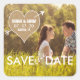 Boda Rústica Salva al Pegatina de la Fecha. Diseñado por Elke Clarke© Negrita, texto blanco simple y moderno en un corazón abrasador perforado por una flecha blanca. Personalizable completo si selecciona "personalizar". Reemplace la foto de ejemplo mostrada con su propia foto de compromiso.