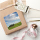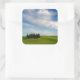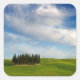 Foto pegatina de un grupo de cipreses en un paisaje con colinas verdes y flores amarillas bajo hermosas nubes blancas cerca de Torrenieri en el Val d'Orcia (valle de Orcia) en Toscana, Italia.