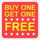 Pegatinas de venta al por menor cuadrados, especiales, con el texto amarillo "Compra uno, consigue uno gratis" en un fondo rojo con estrellas blancas encima y debajo de la palabra "gratis". Grandes pegatinas de venta para su negocio.