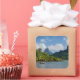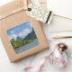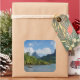Pegatina fotográfico cuadrado de la bahía tropical de Cook con fondo de barco y volcán con palmeras y jungla en la isla de Moorea, cerca de Tahití en el archipiélago Pacífico Polinesia Francesa.