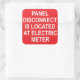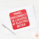 Una hoja de seis pegatinas rojos de 3' x 3" con letras blancas que dice: "Desconexión del panel localizada en el medidor eléctrico". Para que los electricistas lo usen al etiquetar paneles eléctricos remotos.