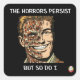 La imagen muestra a un hombre personalizado de estilo vintage con el pelo rebanado y una sonrisa ancha e inquietante. Sin embargo, un lado de su cara está terriblemente desfigurado, apareciendo como si lo hubieran quemado o derretido, revelando carne cruda y grotesca debajo. Encima y debajo de la imagen, el texto en negrita y en blanco dice: "LOS HORRORES PERSISTEN, PERO TAMBIÉN LO HAGO". El fondo negro contrasta marcadamente con el texto y la naturaleza misteriosa y macabra del ilustracion se destaca aún más. En la esquina inferior derecha, un pequeño emblema añade un toque oficial o propagandístico al diseño. El tono general es oscuro y inspirador, lo que sugiere resiliencia frente al horror o el sufrimiento.