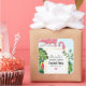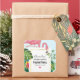 Pegatinas de velas o jabones con un flamingo rosa lindo y caprichoso. Rodeado de hojas tropicales verdes y flores de hibisco rojas y amarillas. Marco de gradiente de oro cuadrado en el centro.
