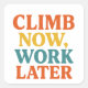Celebra tu pasión por la aventura con este audaz pegatina de "Escalar ahora, trabajar más tarde". Con una tipografía de inspiración retro en naranja vibrante, amarillo y verde azulado, este diseño es perfecto para escaladores de roca, excursionistas y entusiastas al aire libre. Póngalo en su equipo, botella de agua o laptop para un divertido recordatorio de que hay que priorizar la aventura. Una obligación para los guerreros de fin de semana y los amantes de la naturaleza por igual.