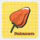 Una pimienta de chile habanero naranja está decorada con patrones inspirados en diseños de baldosas de cemento cubano y se sienta en un fondo amarillo con una versión más pequeña del mismo patrón y una etiqueta de guión en la esquina. Esta pimienta muy picante fue cultivada originalmente en la península de Yucatán, pero recibe su nombre de La Habana en Cuba debido al fuerte comercio a través de esa ciudad.