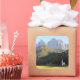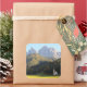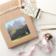 Foto pegatina de recuerdo cuadrado de la iglesia de San Giovanni in Ranui (Sankt Johann) frente a los picos montañosos de Geisler o Odle dolomites en Santa Maddalena (Sankt Magdalena) en el Val di Funes en Italia.