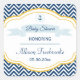 Este pegatina Baby Shower redondeado cuadrado personalizado tiene un tema náutico. En el fondo, un patrón de zigzag de chevron azul marino y blanco con un marco curvado dorado y blanco en el medio. En la parte superior hay un ancla de un barco azul marino dentro de una cuerda blanca. Debajo, Baby Shower está escrito con un tipo de letra cursiva en un suave cartel azul. A continuación, puede personalizar el nombre de la madre junto con la fecha de la ducha para bebés. Mercado gráfico de derechos de autor