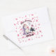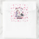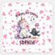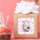 Un bonito unicornio de color pastel con cuerno dorado que canta alegremente junto a un pequeño mirlo negro. Ambos personajes están rodeados de corazones rosados flotantes y notas musicales, creando una escena alegre y caprichosa. El unicornio, con su forma rosada adornada con una flor, tiene una expresión encantadora y infantil que añade a la atmósfera mágica y juguetona. El nombre de la parte delantera y de la parte trasera es personalizable, ¡cambia con el que quieras!