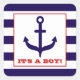 Un pegatina con ducha de bebé con un ilustracion de ancla azul sobre un fondo de rayas azules. El texto dice "¡Es un chico!"