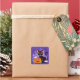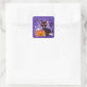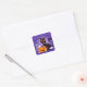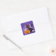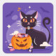 Un capo negro con ojos brillantes se sienta junto a una calabaza llena de dulces coloridos. El gato tiene una expresión juguetona contra un fondo morado y espeluznante con murciélagos y nubes.