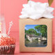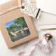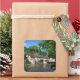 Pegatina fotográfico de souvenirs cuadrado del castillo y del pintoresco pueblo histórico de Ségur-le-Château con sus casas de entramado de madera junto al río Auvézère en Limousin, Francia.