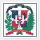 Escudo de la República Dominicana. El escudo de armas de la República Dominicana tiene un escudo de colores igualmente resguardados como la bandera, apoyada por una rama de laurel (izquierda) y un frontón de palma (derecha); encima del escudo, una cinta azul muestra el lema nacional: Dios, Patria, Libertad (Dios, Patria, Libertad). Debajo del escudo, aparecen las palabras República Dominicana en una cinta roja. En el centro del escudo, flanqueado por seis lanzas (tres a cada lado), los cuatro primeros carteles dominicanos, hay una Biblia con una pequeña cruz dorada sobre ella, abierta (según la creencia popular) al Evangelio de Juan, a las 8:32, que lee Y la verdad os hará libre. El escudo de armas aparece en el centro de la bandera de la República Dominicana.