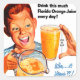 Imagen retro publicitaria que promueve el consumo diario de jugo de naranja. Un niño sostiene un cántaro y un vaso de jugo de naranja. Lo único que agregaría es asegurarme de que sea libre de OMG