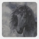 un maravilloso retrato de caballo friesiano negro con un cielo nublado en el fondo.