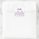 Un pegatina cuadrado con flores de lila y nombre. Personalizar al pegatina con su nombre o texto especial, color de fondo, entre otras opciones.