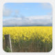Un campo de flores amarillas brillantes se extiende bajo un cielo parcialmente nublado, con montañas visibles a lo lejos. Una valla de madera en primer plano aporta un toque rústico al paisaje. Esta imagen fue tomada cerca de Ararat en Victoria, Australia.