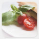 Pegatina fotográfico cuadrado de comida saludable italiana que consiste en un sándwich de panini y un tomate, hojas de albahaca verde y queso mozzarella sobre un fondo blanco.