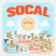 Una escena luminosa y colorida ofrece una vista espectacular del sur de California - personajes adorables disfrutan del cálido sol de California mostrando los parques de Los Ángeles, San Diego, Riverside, Palm Springs y Anaheim con Anza Borrego y Joshua Tree, así como las ciudades fronterizas de Tijuana, Tecate y Mexicali. Esta encantadora escena lo tiene todo: un surfista cuelga diez mientras una sirena se alza sobre una roca, una ballena asesina salta del agua, animales del zoo saludan a los turistas, una pareja de playa muscular flexa para impresionar mientras un T-Rex ruge un desafío y un tanque se mueve en posición y mucho más.. Cielos azules por un lado, cielos naranjas por el otro..