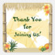 Un diseño gráfico del Fiesta Tropical Luau Hawaiian Tiki Hut por la artista/diseñadora Charmaine Paulson en un pegatina de favores. El pegatina tiene el texto (personalizable) Gracias por unirse a nosotros. ©2012charmainepaulson