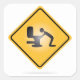 Pegatina con un signo de advertencia de tráfico amarillo con un ícono vomitando sobre un inodoro que muestra una resaca.