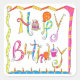 Happy Birthday pegatina presenta arte caprichoso dibujado a mano usando globos, un quequito y un pastel de cumpleaños para ayudar a formar las cartas. Las palabras del cumpleaños feliz están rodeadas por un borde débil.
