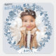 Agradables pegatinas de fotografía de Navidades. La corona azul festiva y el tema de los ornamentos con el texto tipográfico. La fecha del año puede ser personalizada por usted. Reemplace esta plantilla de foto infantil de invierno con su foto subida. Una hermosa manera de compartir una foto favorita esta temporada de vacaciones.