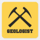 Geólogo - pegatina amarillo y negro con letras de estilo colegiado y gráfico de martillos de roca cruzada.