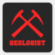 Geólogo - pegatina negro con letras de estilo colegiado rojo y martillos cruzados de roca gráfica.