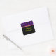 Un pegatina personalizado con Feliz Halloween en personalizados y confusas letras de guión. El fondo tiene rayas naranjas y amarillas en un fondo negro y violeta rayado. Haga clic en Personalizar para cambiar las fuentes, el tamaño y más.