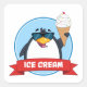 Un pingüino de pie sostiene un helado con una pancarta que dice helado. Este diseño parece realmente efectivo para estos Pegatinas