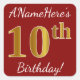 Este sencillo diseño pegatina de cumpleaños muestra un mensaje como "¡El décimo cumpleaños de ANameHere!", con el "décimo" con un aspecto de color falso/imitación de inspiración dorada, sobre un fondo de color rojo. El nombre se puede personalizar. Pegatinas como estos podrían ser tal vez un regalo para alguien que esté celebrando su décimo cumpleaños, o tal vez podrían ser usados como decoraciones en una fiesta de cumpleaños. [~Z0000245]