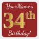 Este sencillo diseño pegatina de cumpleaños incluye un mensaje como "¡El cumpleaños 34 de tu nombre!", mientras que el "34" tiene un aspecto de color falso/imitación de inspiración dorada, sobre un fondo de color rojo. El nombre se puede personalizar. Pegatinas como estos podrían ser tal vez un regalo para alguien que esté celebrando su 34 cumpleaños, o tal vez podrían ser usados como decoraciones en una fiesta de cumpleaños. [~Z0000245]