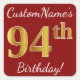 Cuadrada Red, Faux Gold 94th Birthday + Pegatina de nombre