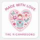 Un pegatina personalizado "hecho con amor" que presenta una muñeca rusa matronoshka anidada en un corazón con las palabras, hecha con amor. Personalízalo añadiendo tu propio nombre. Un toque de bonito para todos tus regalos caseros. Diseñado para ti por Blackberry Boulevard.