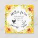 Hermosas peonías amarillas de verano con follaje emparejado con un ilustracion de pollo y un guión rústico para toda su información sobre un fondo blanco y kraft.