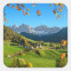 Pegatina de fotografía de recuerdo de la localidad de St. Magdalena o Santa Maddalena con la iglesia característica frente a los picos montañosos de Geisler u Odle Dolomites en el valle Val di Funes (Villnoesstal) en Italia en otoño rodeado de hojas de otoño.