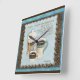 PALETA DE COLORES: azul oscuro de la pizarra, crema, moca, latte, marrón. COLECCIÓN DEL DISEÑO: Reloj de pared decorativo de la cocina para la decoración casera. El "Brew de Deja" es una colección amada mejor de la tela de Audrey Jeanne Roberts. Este reloj de encargo de la cocina del diseñador se ha creado para hacer juego estas ilustraciones. Tazas de café pintadas a mano con la moca, el café express y el café helados Americano, con una frontera horneada a la crema y con pan rallado sobrepuesta en un fondo marrón remolinado del flourish sobre un azul Washington de la acuarela de la mano. El texto lee, "café le hace brillante. Los poderes de la mente de un hombre se proporciónan directamente a la cantidad de café que él bebe," por sir James Mackintosh, historiador escocés, jurista y filósofo. ¡Para el amante o el adicto verdadero del café!