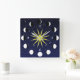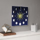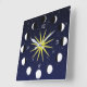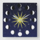 Las fases de la luna rodean un sol que brilla intensamente en un fondo estrellado